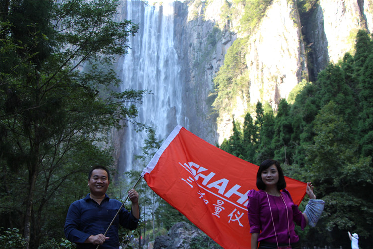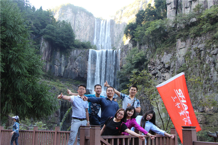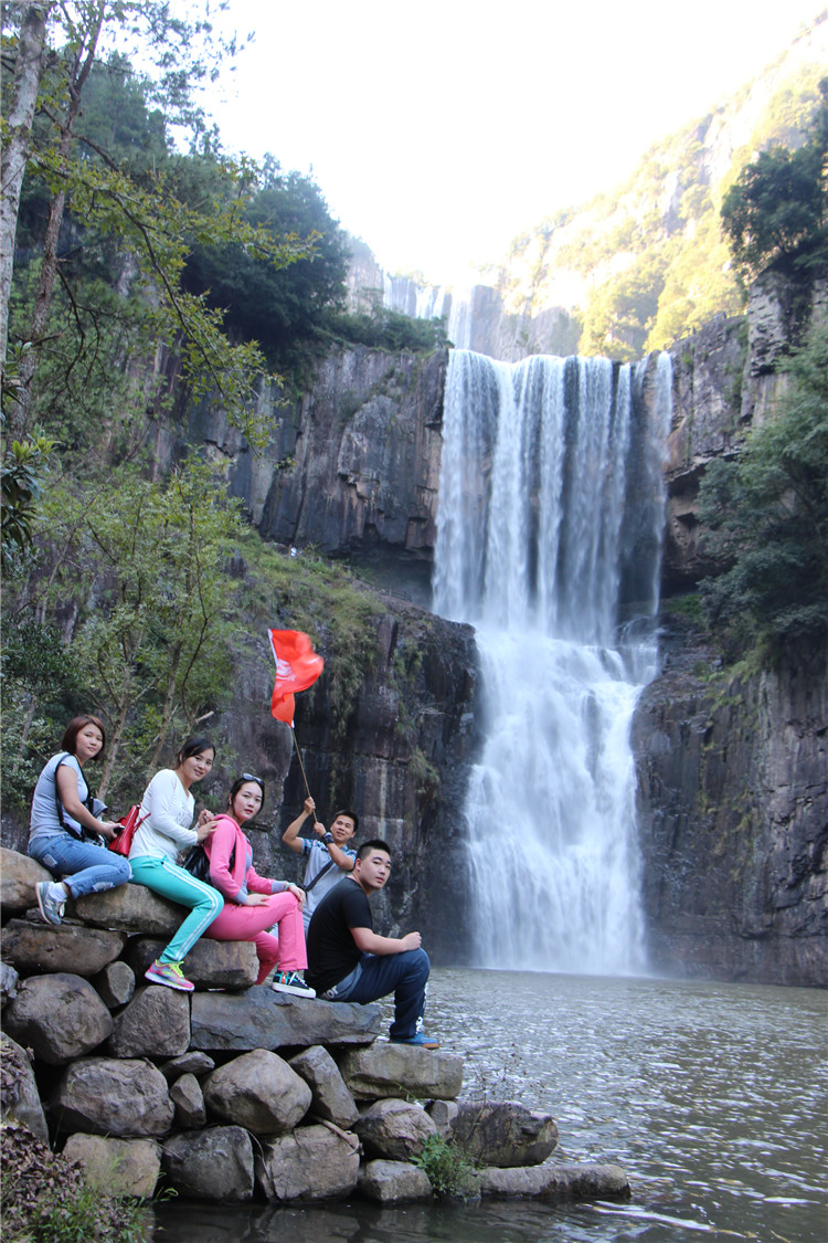 游山玩水之余,也不忘給我們美女帥哥留景做紀念。美景配美女,讓我舍不得這地方了,從下往上觀看,一條白練從空而降,水聲嘩嘩作響,撞擊在石頭上的細小水珠彌漫山間,氣勢磅礴。